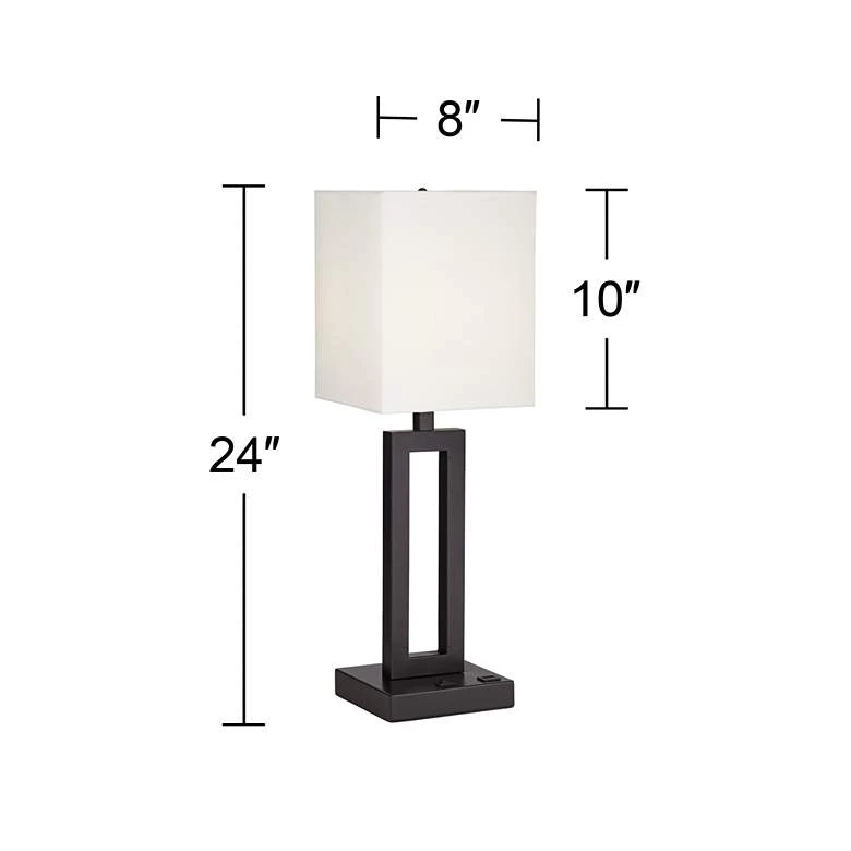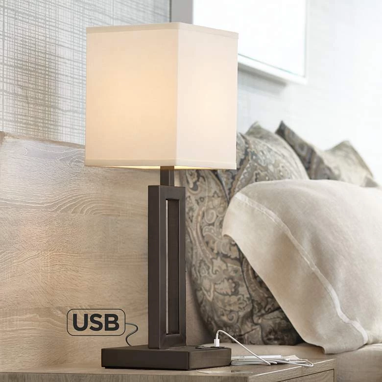 Tall, geometric silhouetting lends a sophisticated vibe to this modern metal table lamp. A defining effect follows a dark bronze finish metal construction, as a linen square shade perfectly complements its geometric profile. A built-in USB port offers access to charging and using electronic devices. This contemporary lamp adds a compelling look to seating ensembles, buffets, and bedroom dressers.