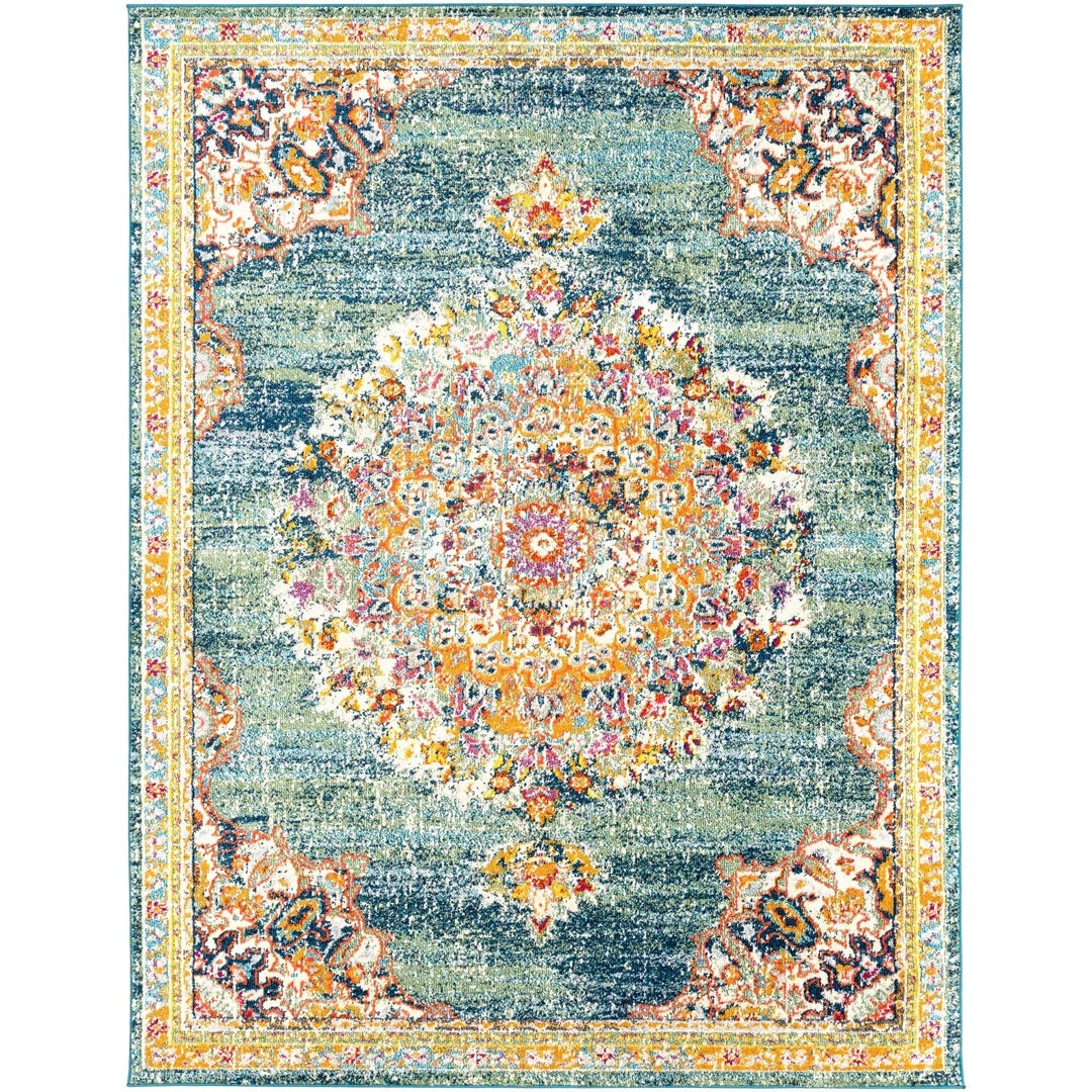 This vibrant collection features a distressed Bohemian pattern in a beautiful blend of teal, navy, pale blue, orange, green, yellow, red, coral, fuchsia, gray, camel, beige, and white. Gorgeous and soft, this rug features a comfortable pile with minimal shedding. Great for high-traffic areas. Provides a burst of color at an excellent price! Machine made in Turkey with 100% polypropylene. Spot or professionally clean only. Rug pad recommended.