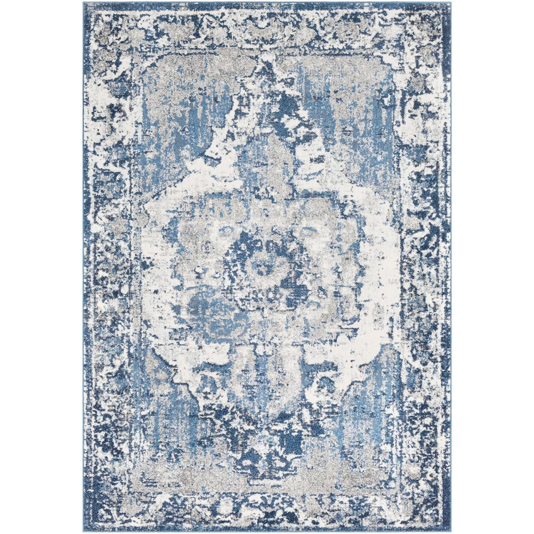 With understated blue tones and distressed vintage patterns, this collection adds great style to any space. Featuring a medium pile, this synthetic rug is great for high-traffic areas with minimum shedding. Machine made in Turkey from 100% Polypropylene. Spot clean or professionally clean only. Rug pad recommended.