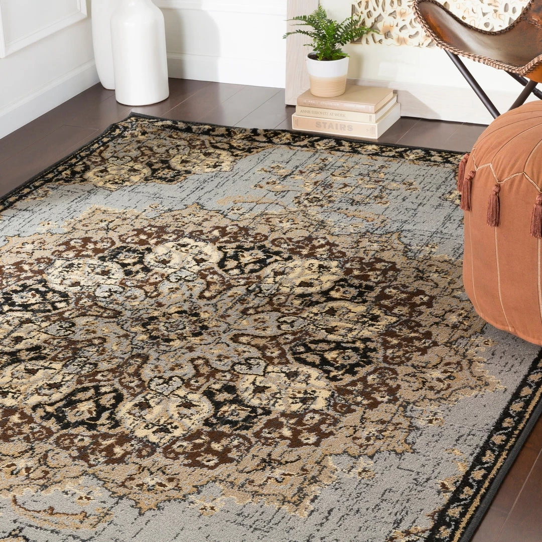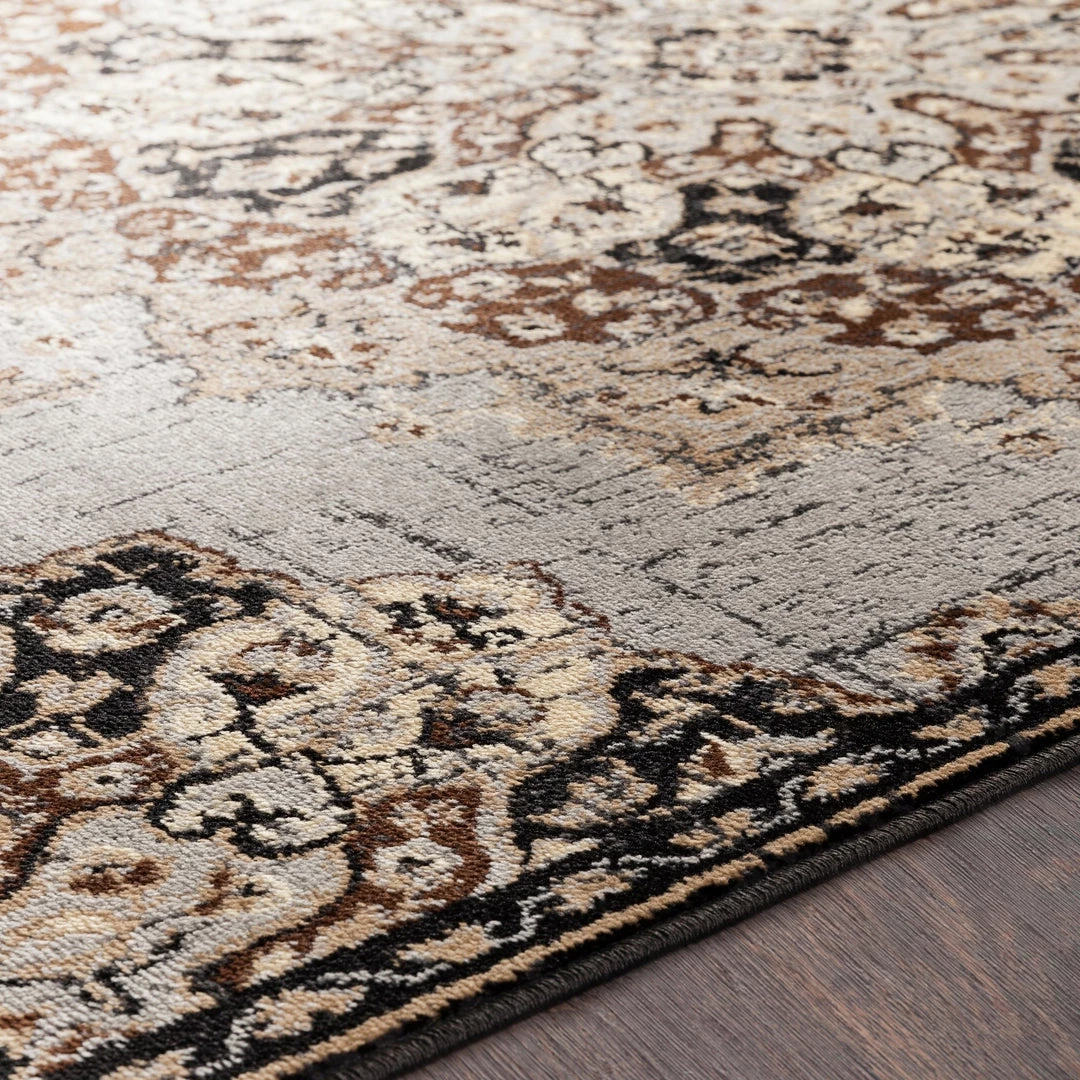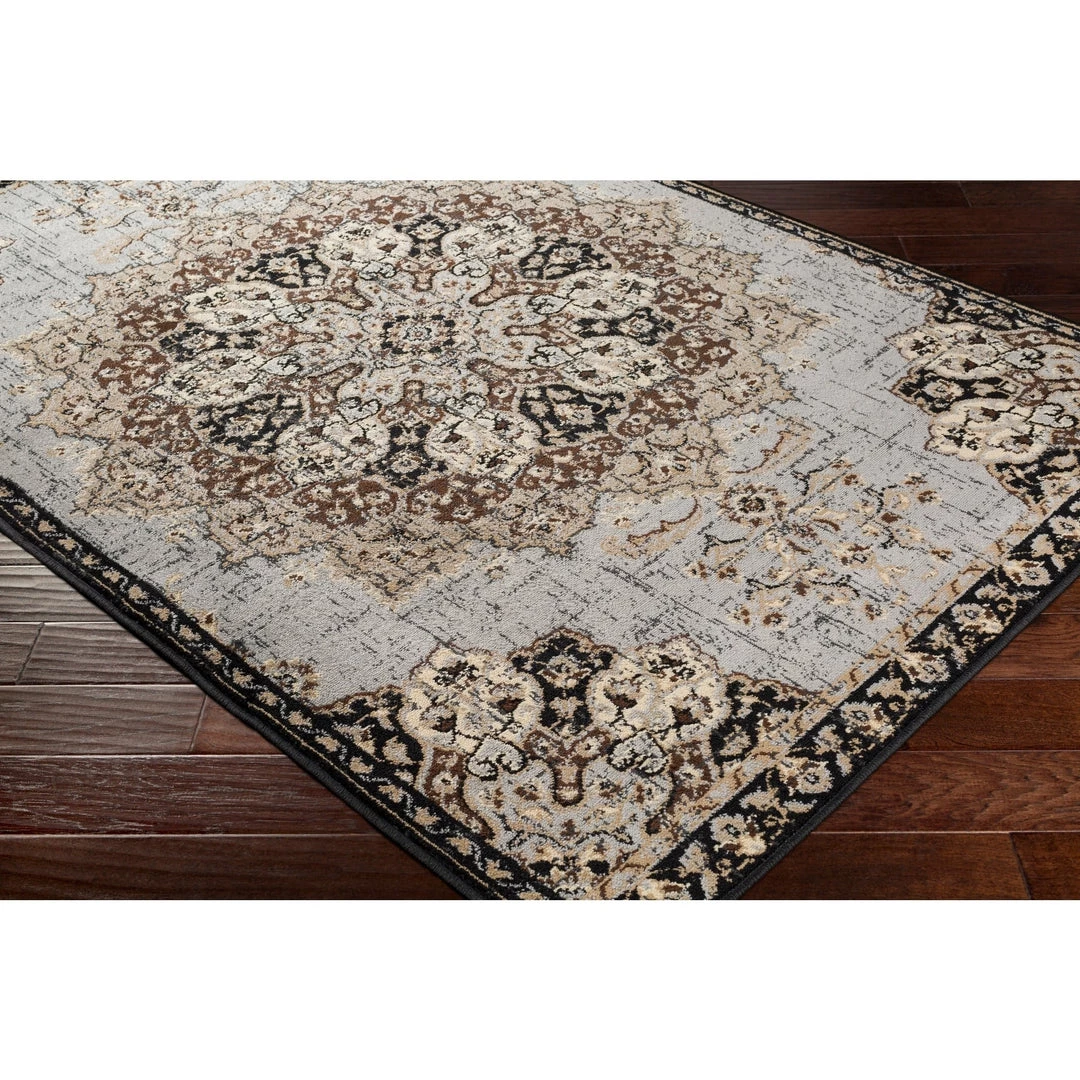 This collection features a traditional medallion pattern in neutral tones of gray, black, charcoal, brown, khaki, and beige. This rug features a comfortable low pile and minimal shedding. Great for high-traffic areas. Machine made in Egypt with 100% polypropylene. Spot or professionally clean only. Rug pad recommended.