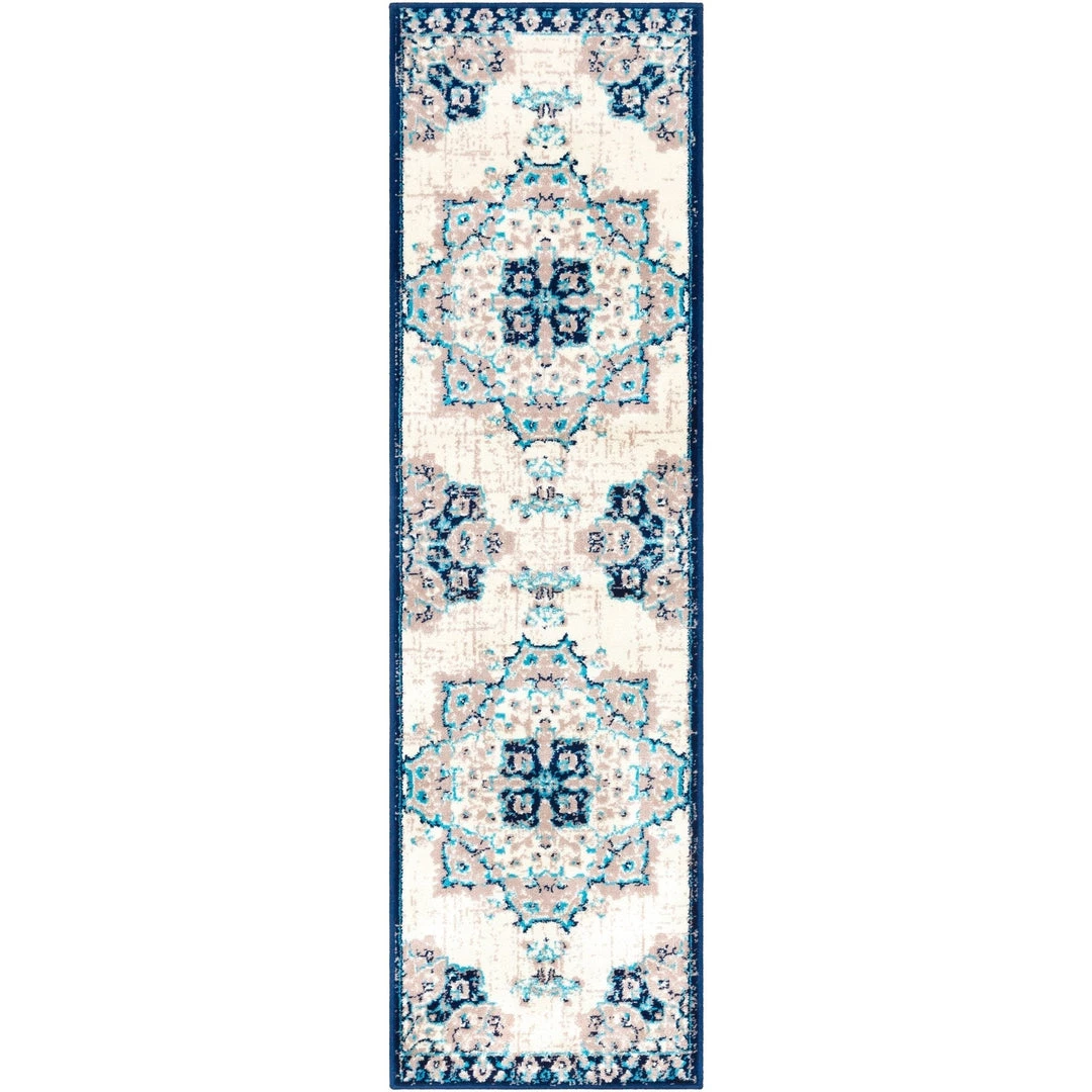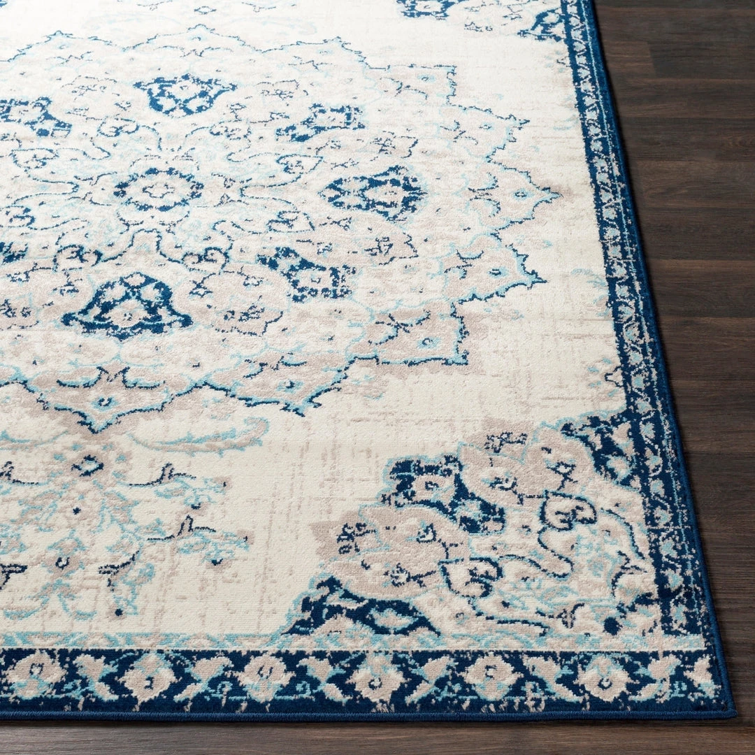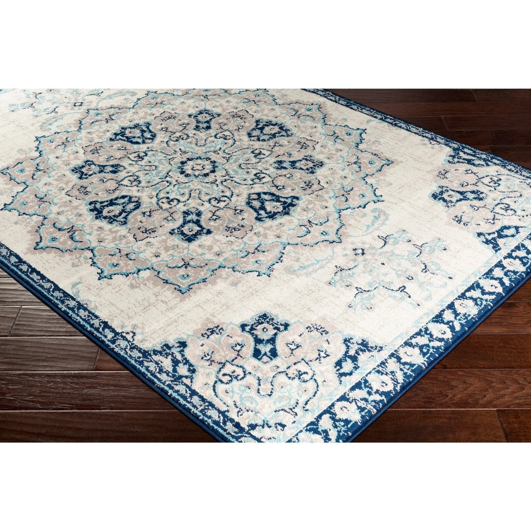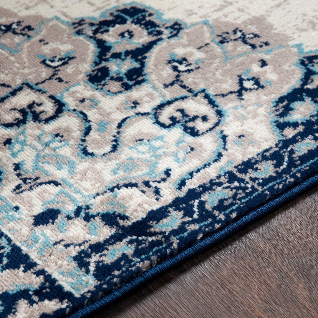 This collection features a traditional medallion pattern in calming tones of aqua, dark blue, light gray, and cream. This rug features a comfortable low pile and minimal shedding. Great for high-traffic areas. Machine made in Egypt with 100% polypropylene. Spot or professionally clean only. Rug pad recommended.