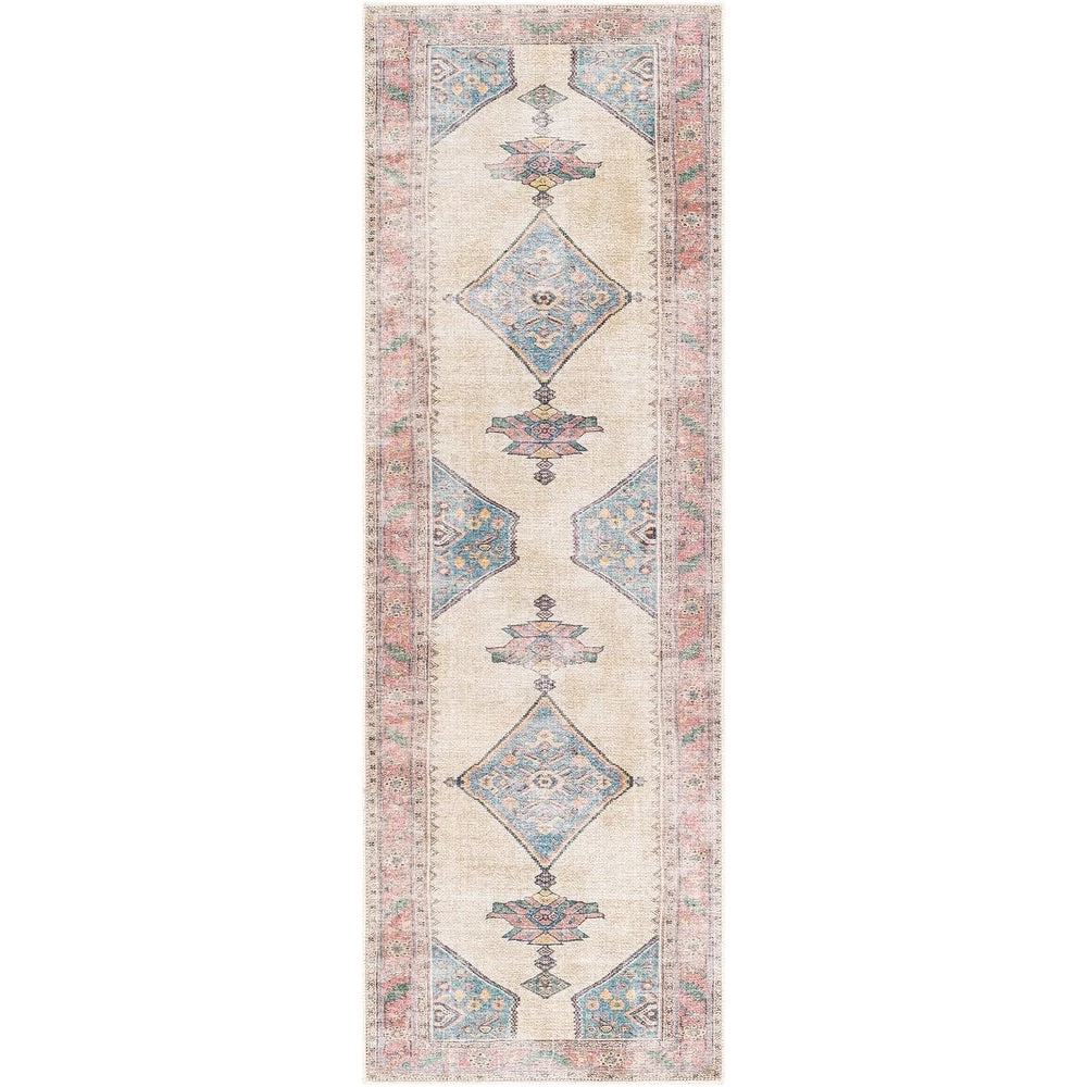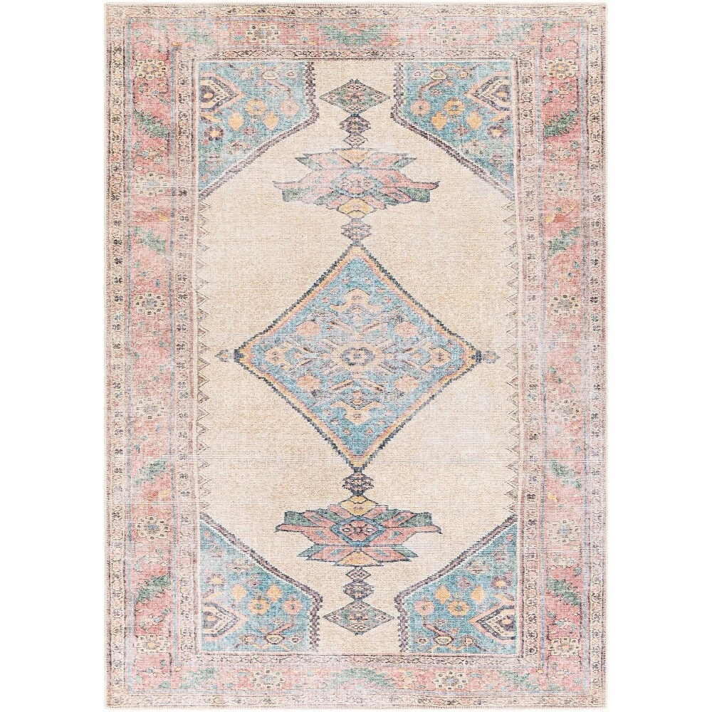 With a striking diamond medallion pattern in beautifully vintage tones, the collection will be a great addition to your home! With a low profile reminiscent of an antique rug, a slightly distressed screen printed pattern, and a soft touch, this piece will add a nice pop of style and comfort. Machine woven in Turkey with 100% chenille-polyester, this synthetic rug is great for high-traffic areas. Machine washable. Rug pad recommended.