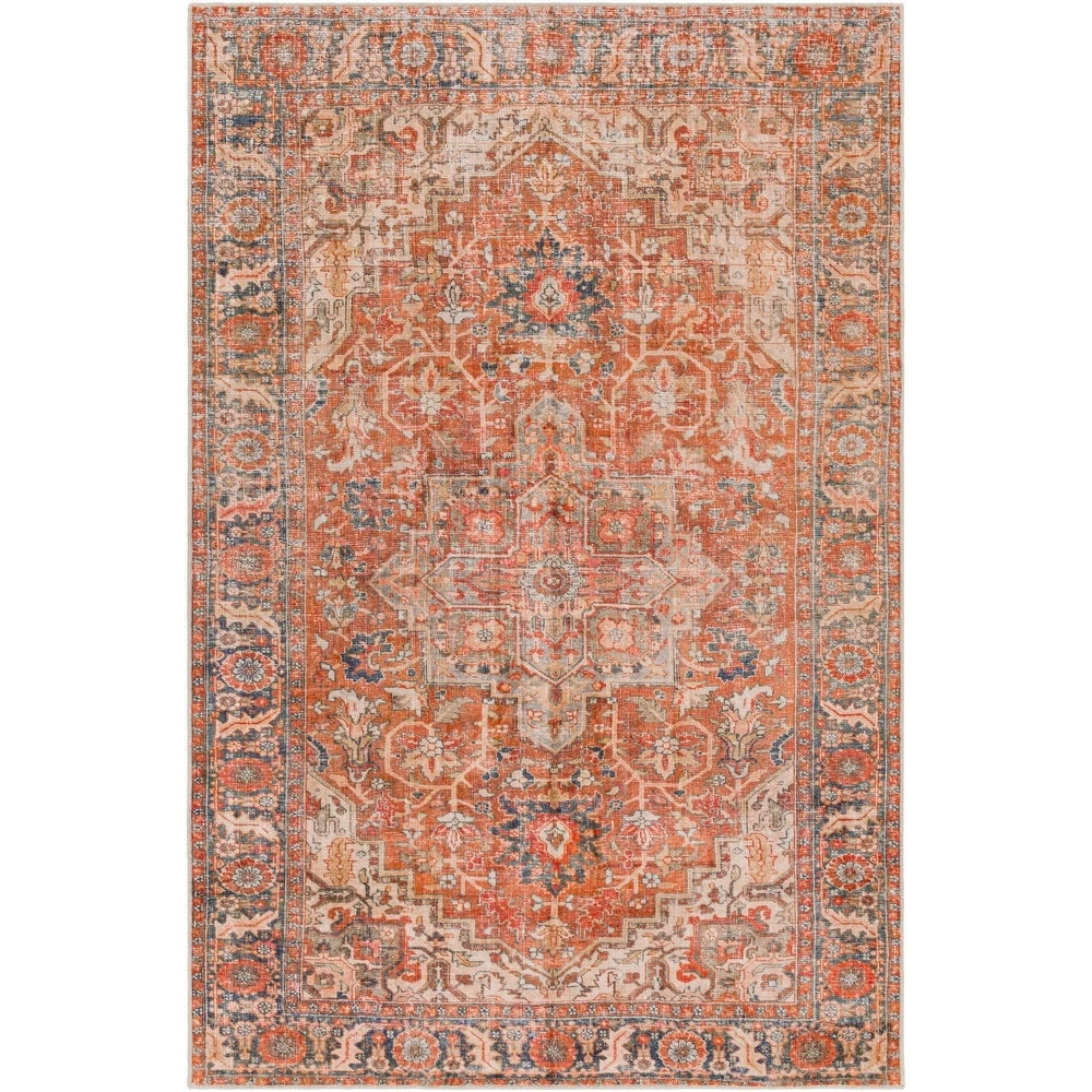 Immerse your senses in the regal hues of the rug. This classic Persian design is a feast for the eyes in a palette of burnt orange, tan, grey, and dark blue. ultra-low pile of .01 inches makes it perfect for any high traffic area of your home, and it’s machine washable! Machine-woven in China with 100% polyester. A rug pad is recommended to prevent slippage and movement. Â Machine washable for a busy lifestyle! .