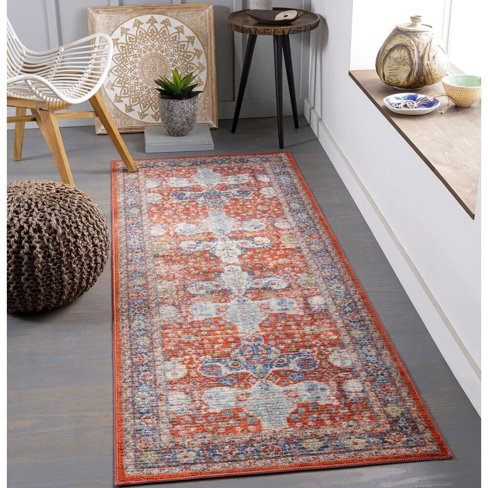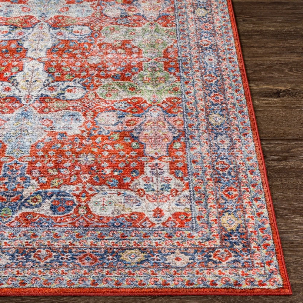graceful maximalism will add a majestic spirituality to any space. Hundreds of tiny flower details are delicately sewn into vibrant red fabric to lend this piece all the regal beauty of stained glass. Perfect for high-traffic areas like a living room, kitchen, or foyer. Machine-woven in Turkey with 100% polyester and a low pile of 0.39 inches. A rug pad is recommended to prevent slippage and movement. Machine washable.