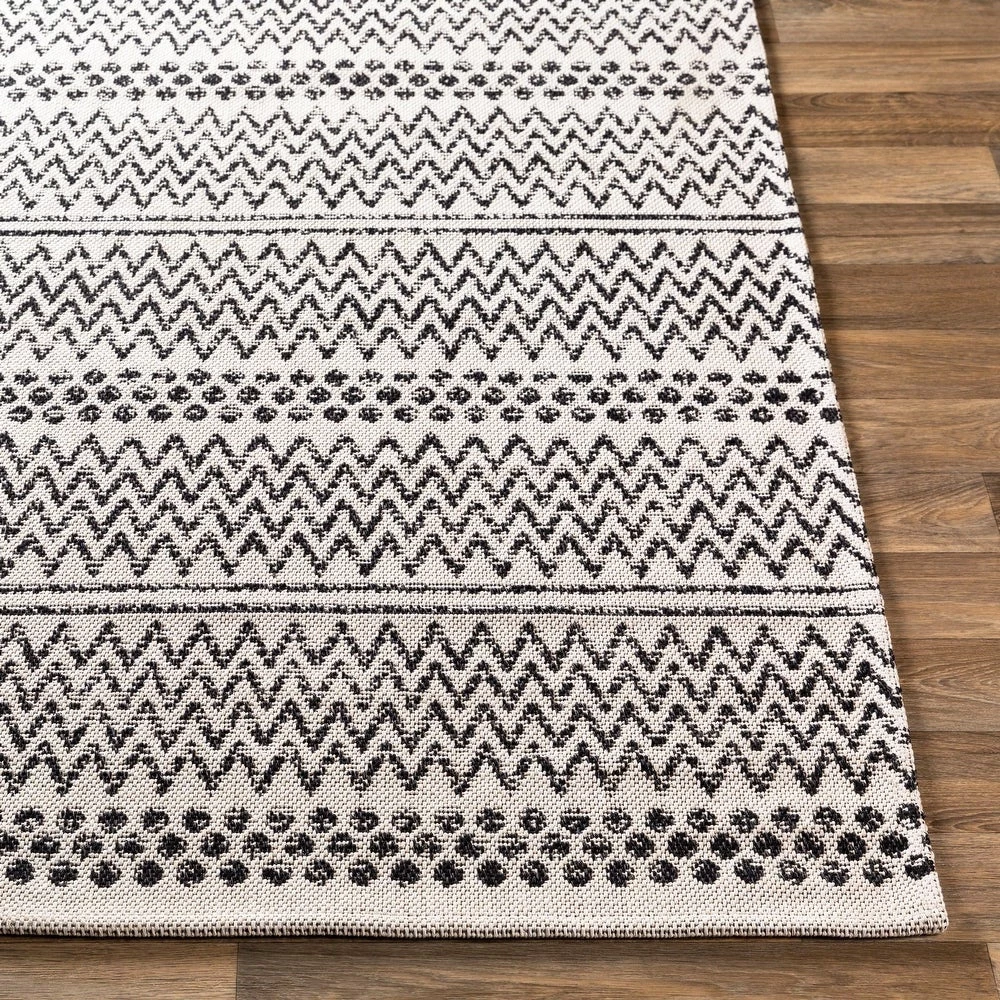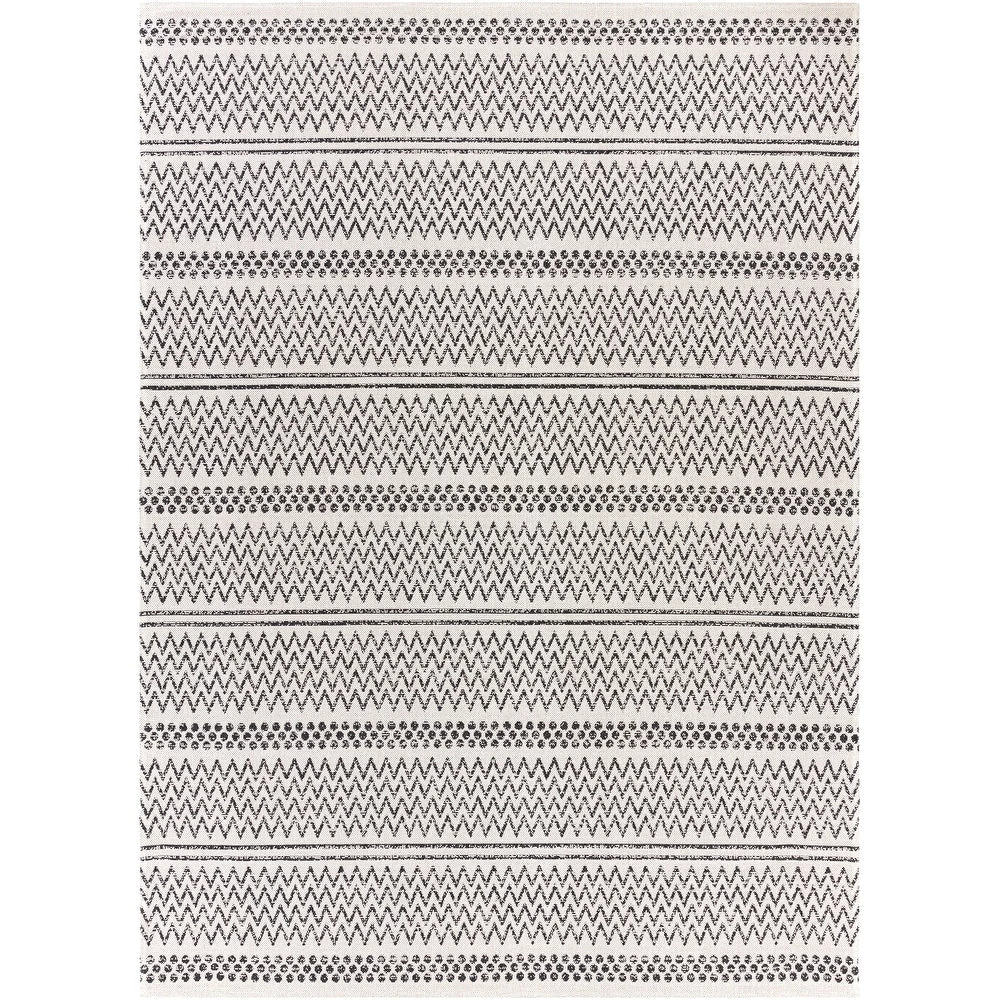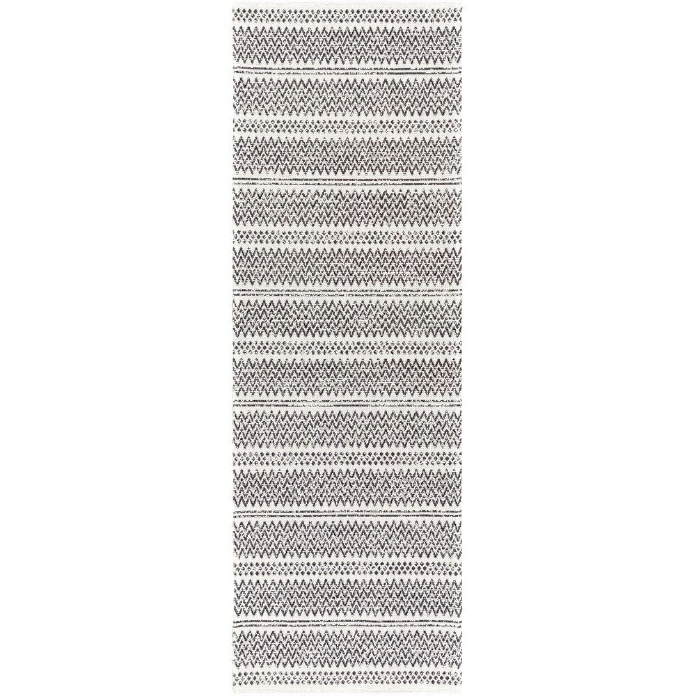Let this Moroccan-inspired area rug with a striking chevron pattern add a global accent to a busy room. Neutral shades of black, cream, and ivory make this rectangular rug from the Collection easy to blend with a variety of existing color and design schemes. The flat-weave rug is machine-made in Turkey using 100 percent cotton to create a casual, pet-friendly floor covering that offers a soft texture underfoot. Trust this durable area rug to hold up beautifully even with frequent daily use in high-traffic areas of your home.