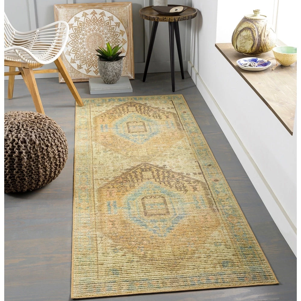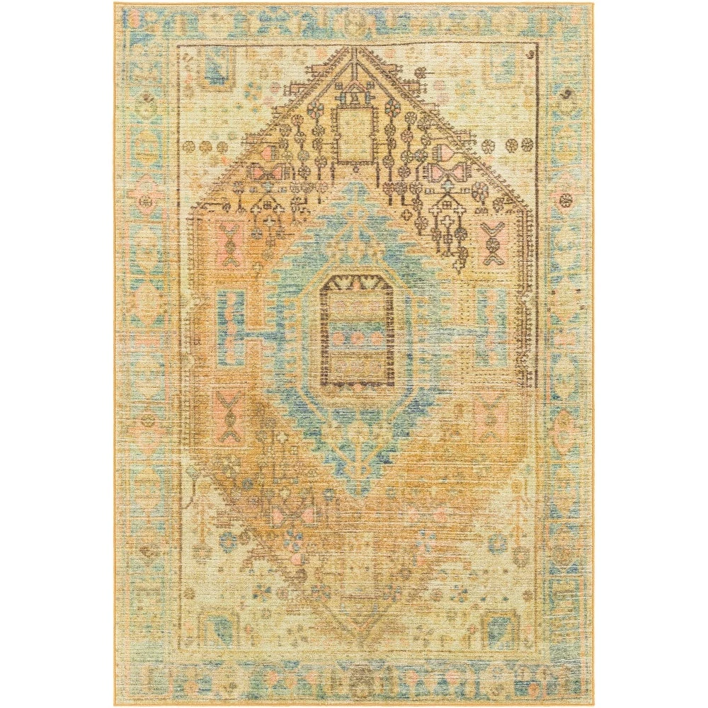 Give any room the timeless appeal of Byzantine art with the rug. This classic Persian design is accented with warm, punchy hues of tan, coral, and denim. Perfect for high-traffic areas like a living room, kitchen, or foyer. Machine-woven in Turkey with 100% polyester and a low pile of 0.39 inches. A rug pad is recommended to prevent slippage and movement. Machine washable.