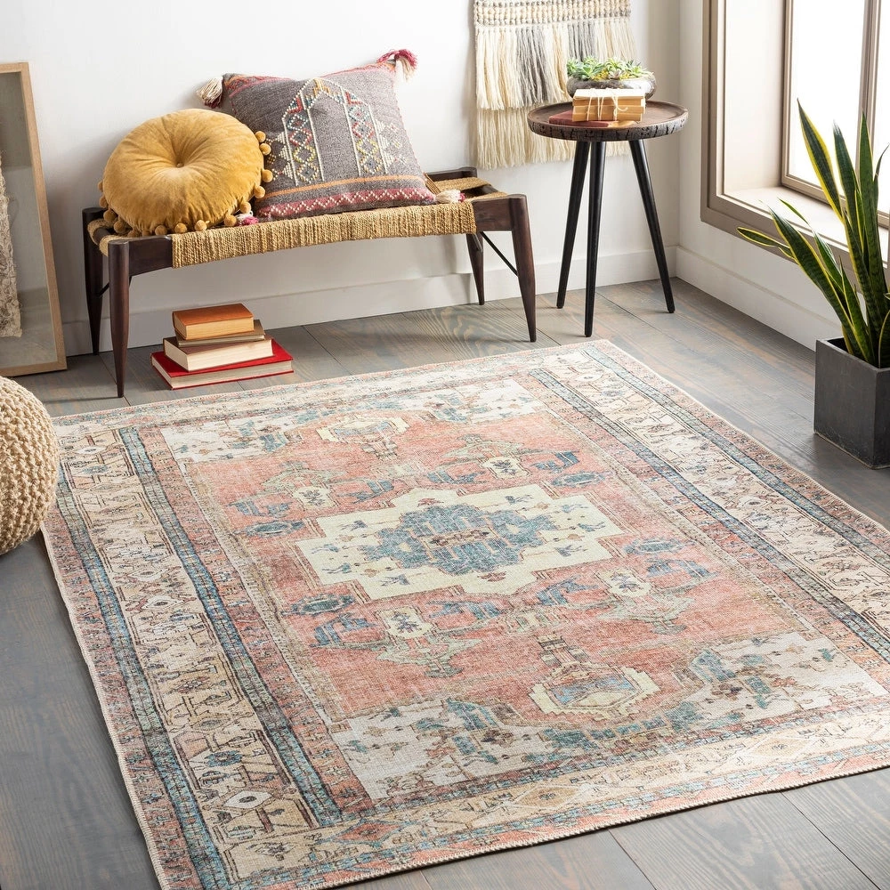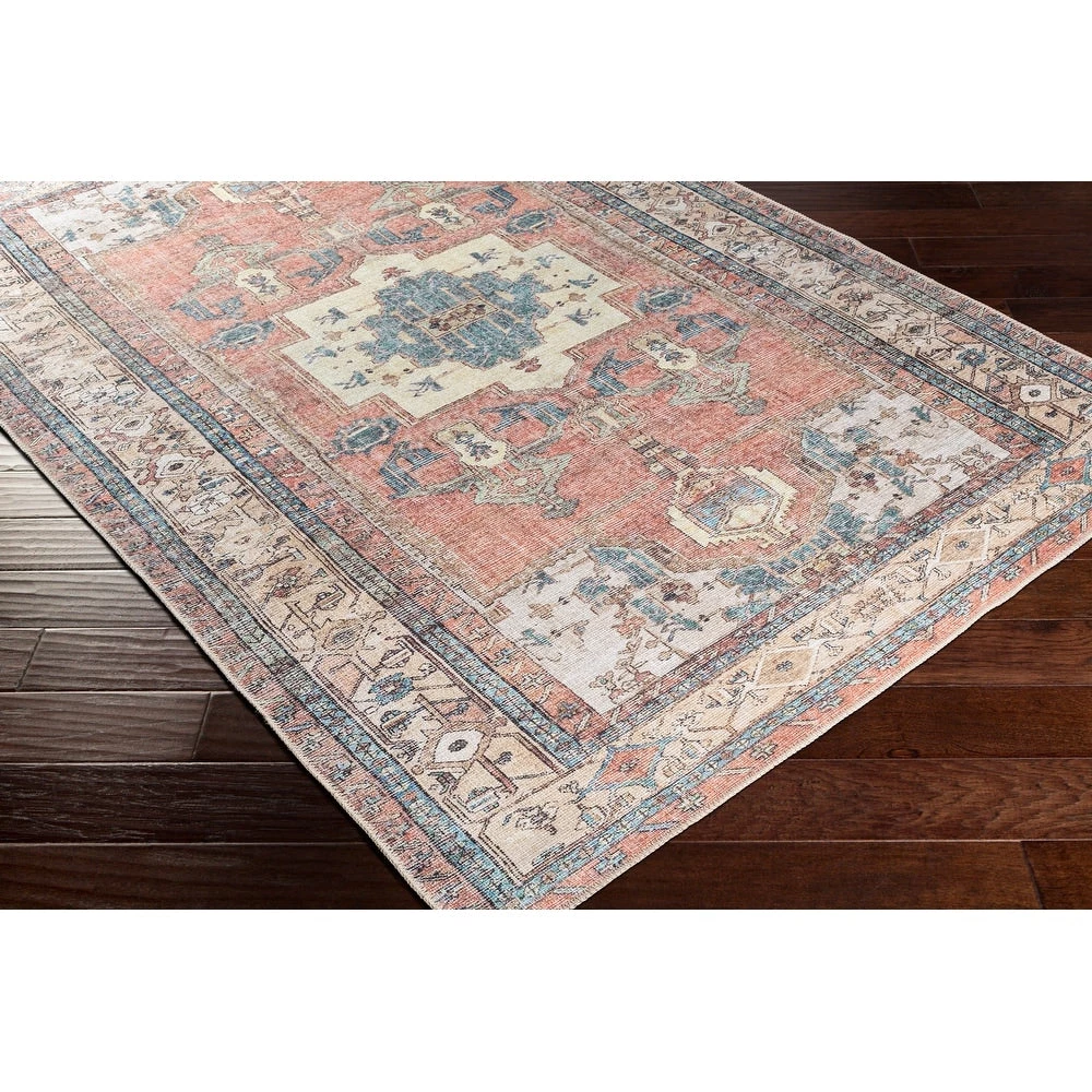 With a striking medallion pattern in beautifully vintage tones, the collection will be a great addition to your home! With a low profile reminiscent of an antique rug, a slightly distressed screen printed pattern, and a soft touch, this piece will add a nice pop of style and comfort. Machine woven in Turkey with 100% chenille-polyester, this synthetic rug is great for high-traffic areas. Machine washable. Rug pad recommended.