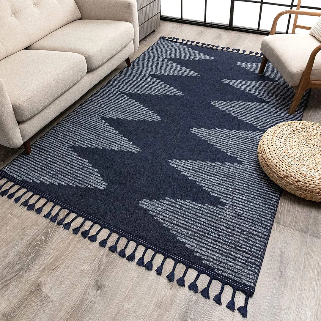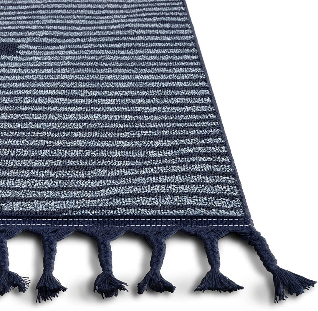 - Plush, medium-height looped pile is plush underfoot. Stain and fade resistant yarns with wood-floor-safe jute backing.