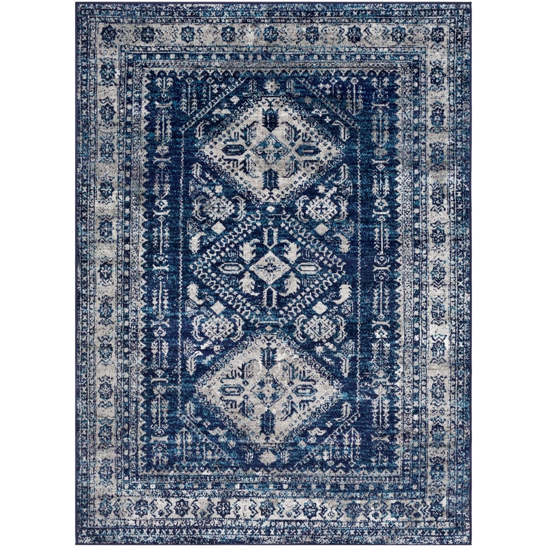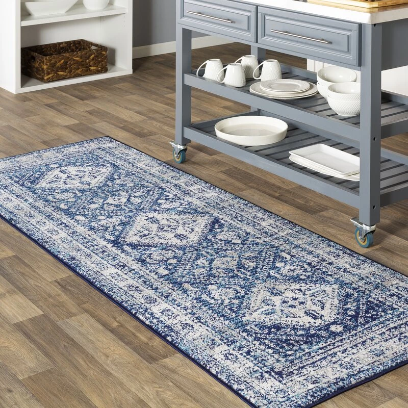 This lovely collection features a distressed Persian pattern in a beautiful blend of navy, light gray, sky blue, and white. Gorgeous and soft, this rug features a comfortable pile with minimal shedding. Great for high-traffic areas. Machine made in Turkey with 100% polypropylene. Spot or professionally clean only. Rug pad recommended.