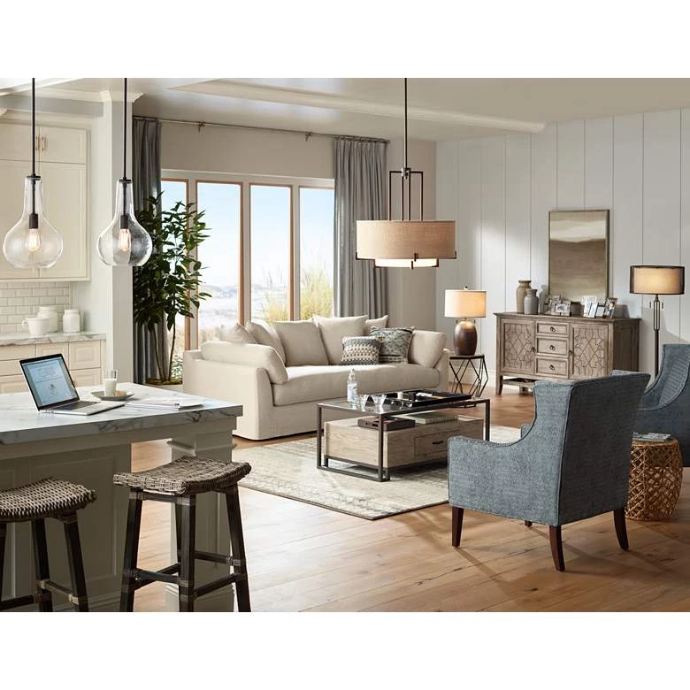 Brighten a living room or seating area with the classic look of this cask-shaped table lamp. The design features a base with a hammered look. The twin light pulls give you lighting flexibility. Turn only one on for TV viewing, or have both on for reading or general room illumination.