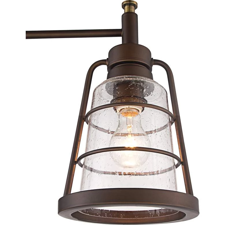 - Oil-rubbed bronze finish over metal construction. Seeded glass shade.