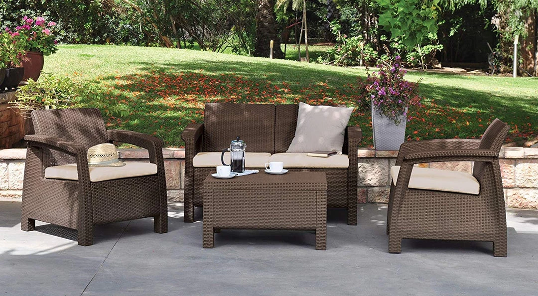 This outdoor patio furniture set comes in a rich rattan brown or grey to suit just about any outdoor décor. Accent your sundeck or offset your poolside setting with this contemporary and ergonomic design. As shown, this furniture grouping features two deep armchairs with polyester weatherproof seat cushions, a coffee table, and a matching love seat. All seating includes ergonomic armrests and backs. The rich look of woven rattan coupled with the robust resilience of unique polypropylene resin construction delivers weather resistant, maintenance-free seating that sets the scene for luxurious outdoor living. You’ll enjoy your seating all day long, from an intimate coffee brunch to some personal time with a good book on a long, lazy afternoon.