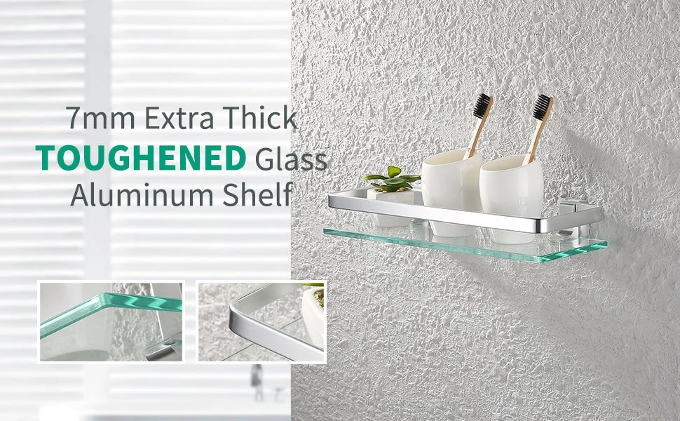 - ALL HARDWARE AND INSTRUCTIONS INCLUDED – 1 x Glass Bathroom Shelf, 1 x Hardware Pack, Installation Instructions. You can contact KES for step by step guide if you need any help. Set screws (for glass shelf), wall-mount screws and instructions are all included, no need to purchase extra hardware.