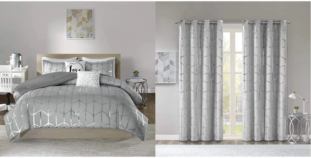 - Fabrication – polyester brushed microfiber accented with geometric silver printing. Decorative pillows come with intricate embroidery and metallic printing to complete the collection. Modern style with stunningly eye catching glamorous design to match your diva personality