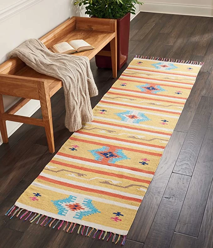 - Tribal influences, warm sunny colors and the casual comfort of a flat weave area rug define the appeal of our Baja Collection
