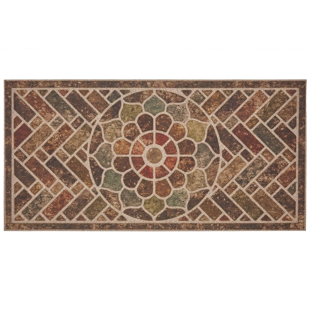 A modern herringbone and floral medallion mosaic cast in a woodgrain inspired texture greets guests with sophisticated style in the Mohawk Homes Ornamental Grain Entry Mat. The tile inspired design with intricate central medallion features a rich neutral color palette of brown, grey, and beige that compliments any entryway.