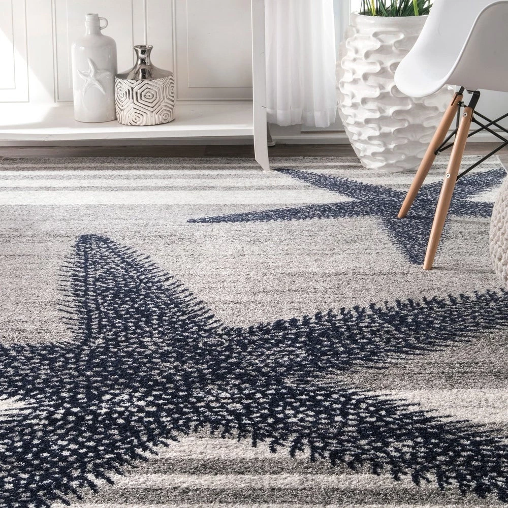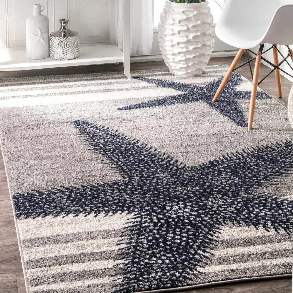 Complement your coastal or beach cottage theme with this refreshing starfishes and stripes area rug in shades of blue and grey. The machine-woven polypropylene yarn is durable in high-traffic areas and ideal for busy homes with pets and kids. This easy-to-clean rug is also shed-resistant for fuss-free maintenance.
