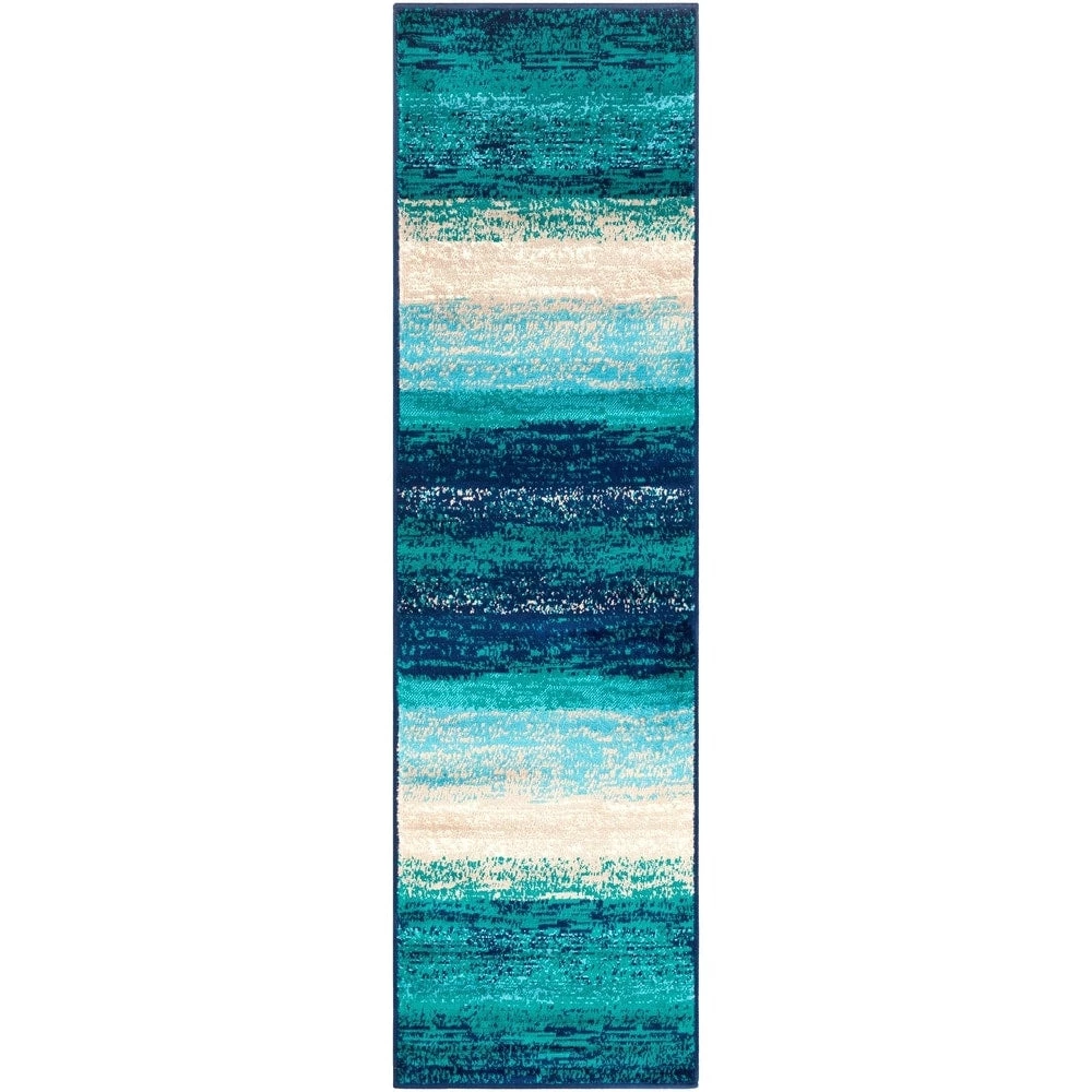 This collection features a contemporary striped pattern in calming tones of teal, aqua, dark blue, light gray, and cream. This rug features a comfortable low pile and minimal shedding. Great for high-traffic areas. Machine made in Egypt with 100% polypropylene. Spot or professionally clean only. Rug pad recommended.