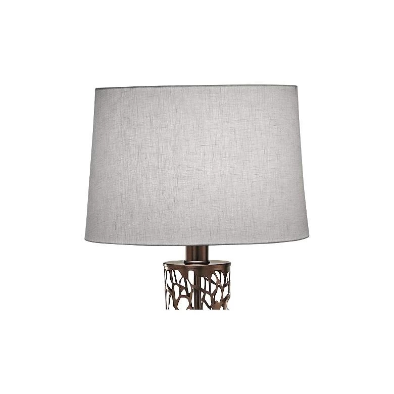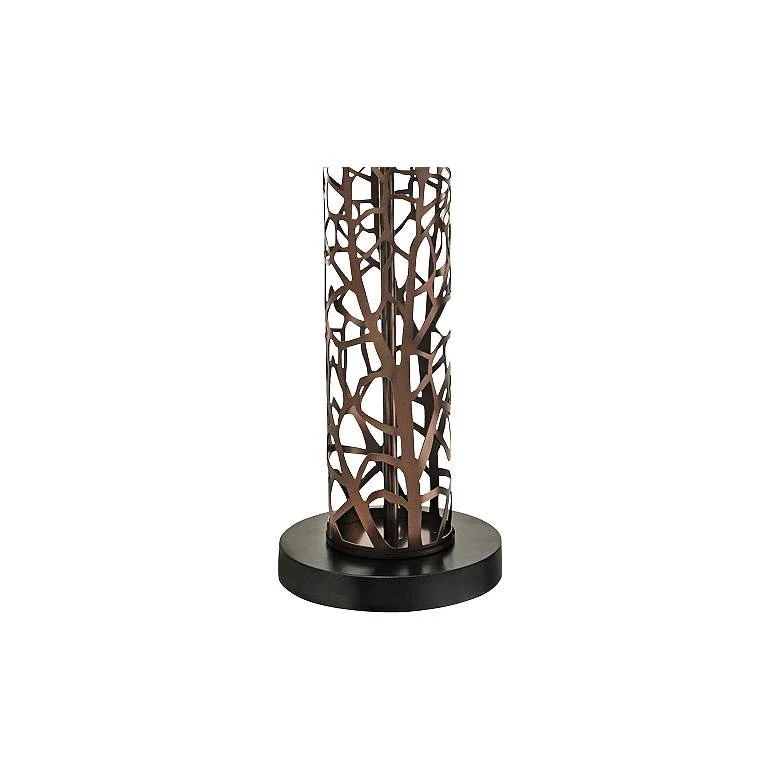 Laser cut metal branch shapes offer a nature-inspired look to this oil rubbed bronze metal column table lamp.