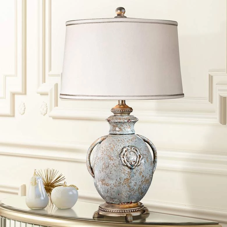 Distressed light blue and tan glazes meld with rust undertones to bring you the Cancello table lamp. Silver leaf details grace the foot and neck of the design, and a silken off-white shade with double trim diffuses the glow and provides a modern contrast to the antique-style base.