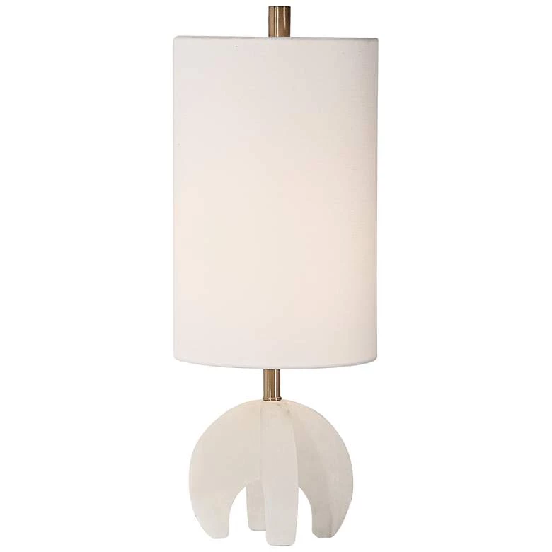 Add depth to a modern living room with this accent buffet table lamp by Uttermost. Designed with polished alabaster, the cutout base creates a stunning visual. Metallic details, such as iron in a plated brushed nickel finish open up any space with contemporary charm. A round hardback drum shade in white linen offers a soft glow.