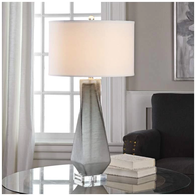 This handsome, sculptural charcoal gray glass table lamp is accented with brushed nickel highlights and a clear crystal base.