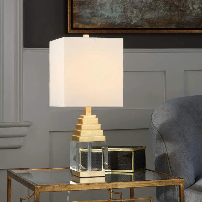 Stunning in its design details, this beauty from Uttermost adds a dose of edgy personality to any room. With a chunky crystal cube and metallic gold leaf stacked body, it plays with texture and finish. A squared linen fabric shade adds finishing touches to this gold leaf and crystal accent table lamp.