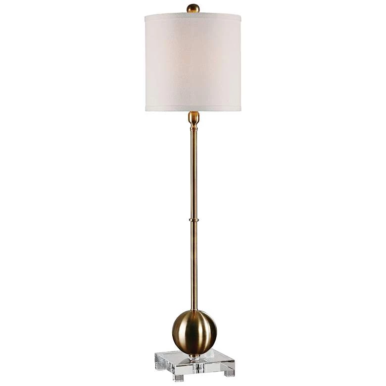 A spherical accent with a slender column and crystal foot characterize this contemporary table lamp by Uttermost.