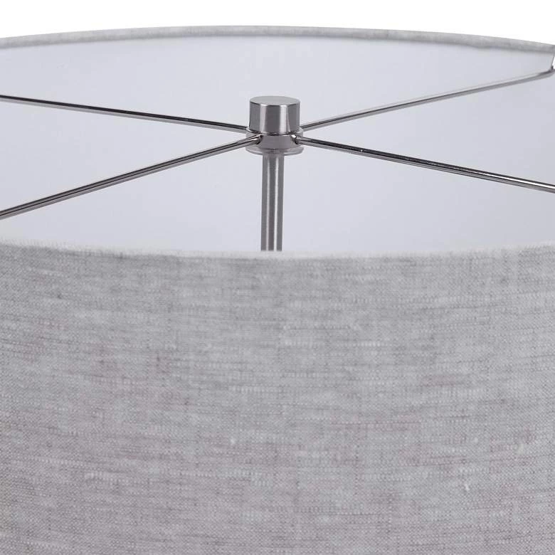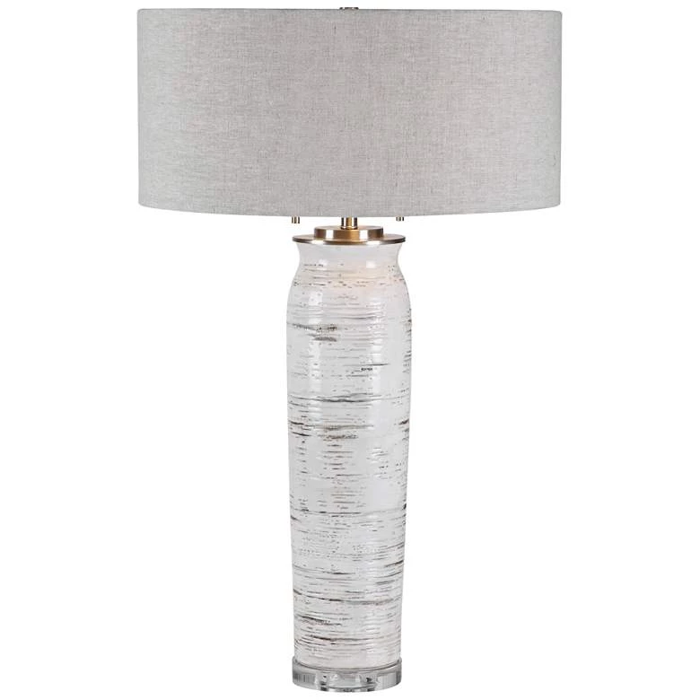 Inspiring lightness adds a soft, casual feel to a tasteful design scheme, creating a perfect balance in an updated space. This two-light ceramic table lamp offers an off-white finish with rust accents over ceramic construction. Designed by Jim Parsons for Uttermost, it offers gorgeous brushed nickel iron accents and a delicate crystal base. Enjoy a sleek, narrow light oatmeal linen fabric hardback drum shade with subbing.