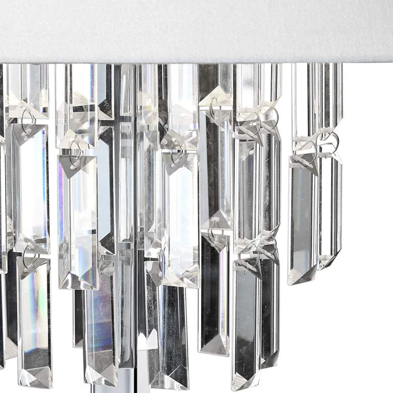 Glittering, luxe style from the Uttermost brand. This sleek design features a thick crystal block and beveled hanging crystal ornaments for sparkle. The crystal is paired with polished nickel plated details and a rectangular white linen shade.