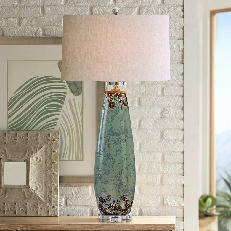 Rustic and refined in the same moment, this transitional ceramic table lamp balances a crystal foot and a charming crackle finish in pale green with rust undertones.