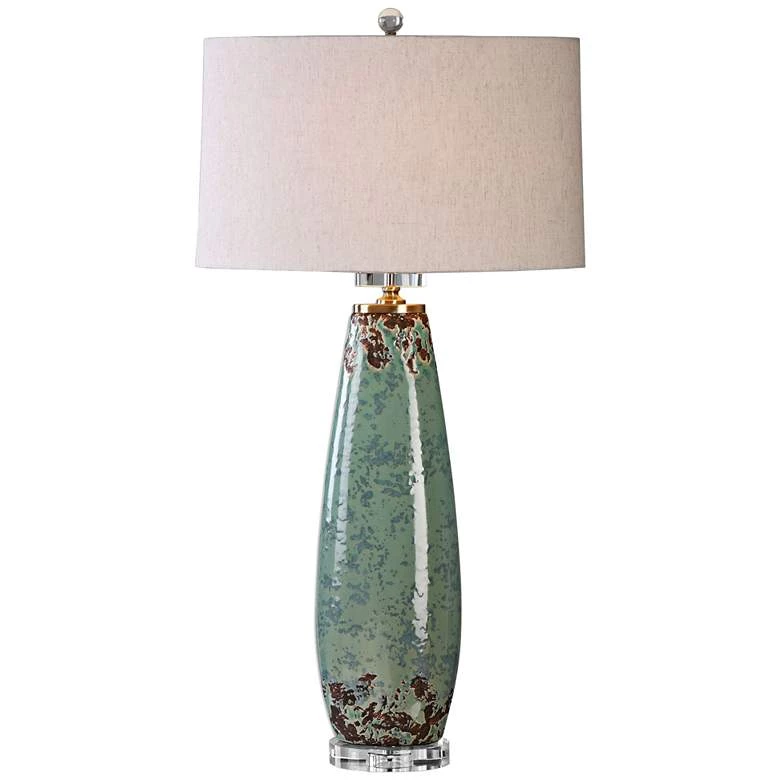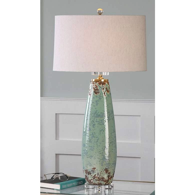 Reinvent any tabletop with this enchanting ceramic table lamp design from Uttermost. Boasting a slender body, the lamp features a striking crackle finish with a pale mint green coloration, gray distressing, and rust undertones. A crystal foot brings a touch of sophistication to enhance the rustic, natural appeal of the ceramic. An oval, off-white linen hardback shade and brushed nickel detailing complete this appealing lamp.
