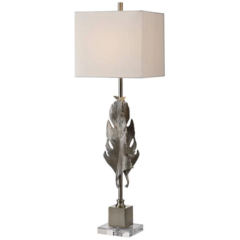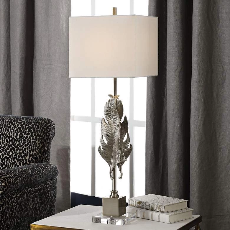 Wonderfully versatile, this silver champagne and steel leaf buffet table lamp sets the stage for a nature-themed entertaining space.