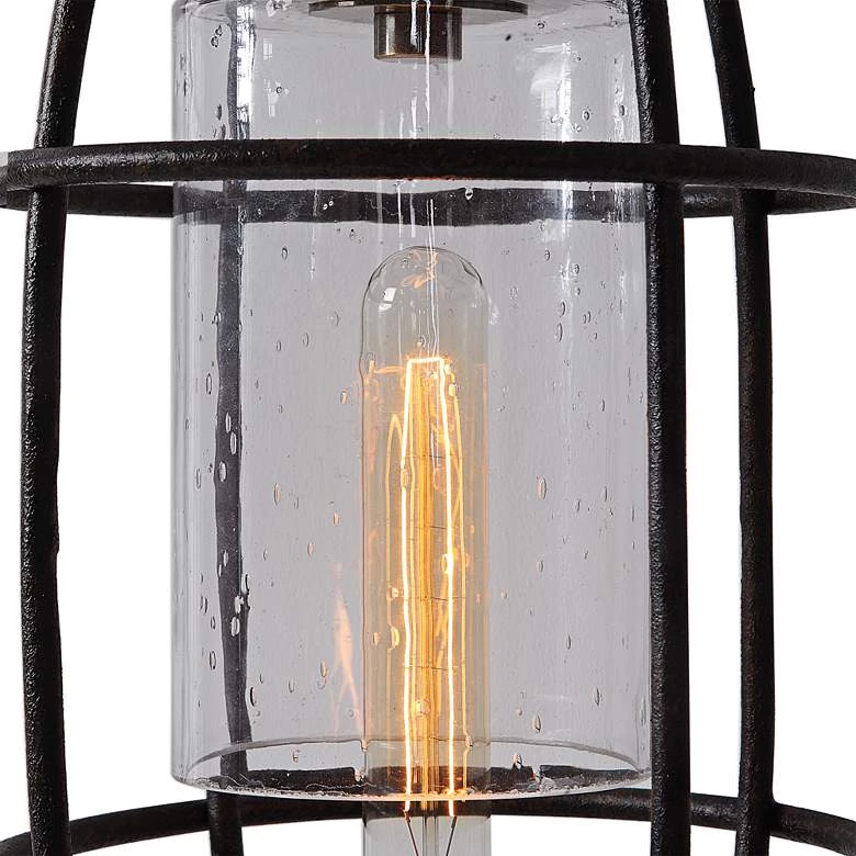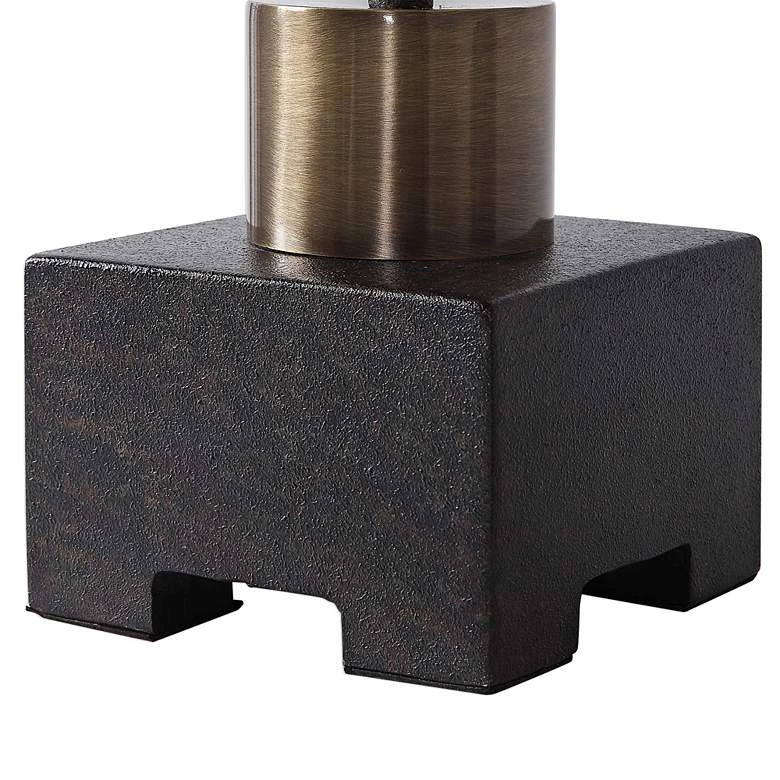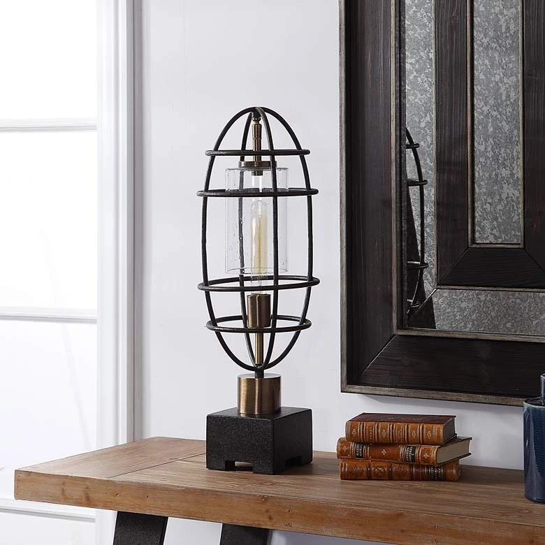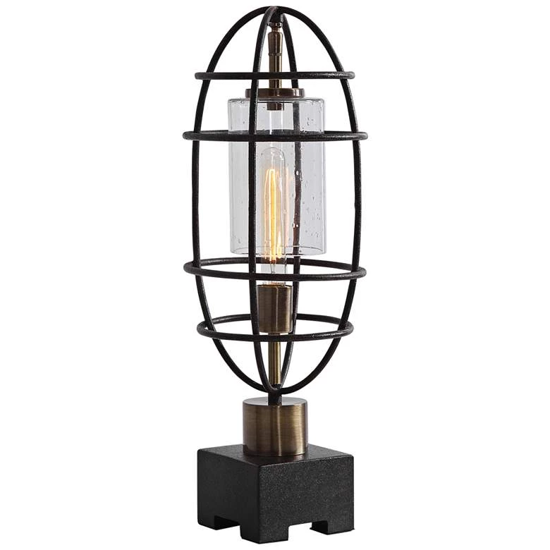 The caged construction of this metal lamp from Uttermost make it a striking lighting solution. Its black iron finish with antique brass accents beautifully complement the crisp white seeded glass shade to give the piece ultramodern appeal. Its sculptural quality balances with its versatility to effectively and beautifully illuminate any countertop space.