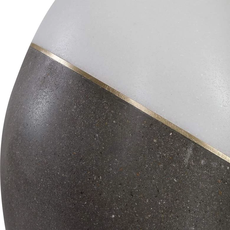This transitional vase table lamp borrows from retro-inspired elements to update a custom space. The Tanali table lamp designed by Renee Wightman for Uttermost offers a slender vase silhouette with an elongated neck, invoking a Mid-Century Modern vibe. A charcoal and polished white finish over concrete and polyresin succeeds at elegant color separation, and brushed gold finish iron accents complement its contrasting palette. This lamp looks superb among a casual or semi-formal cluster of living room seating pieces, and also flatters a master bedroom suite.