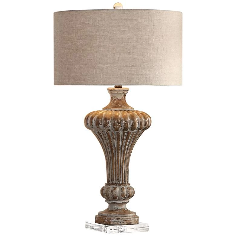 Warm up a traditional space with this warm table lamp from Uttermost, full of ornate details. Constructed of polyresin, the delicate silhouette features a hand-painted aged pecan finish with an antique gray wash. A thick crystal foot elevates while opening up space around the base. Warm and soft, the round hardback drum shade with natural slubbing in light beige linen completes any classic motif.