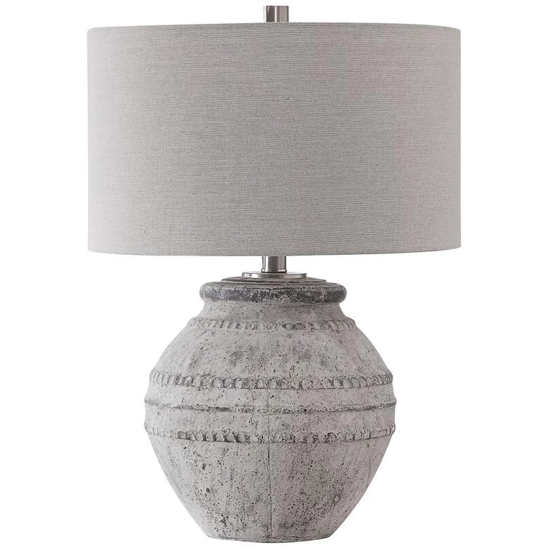 The Montsant distressed stone ivory ceramic table lamp showcases an old-world style that is ideal for a traditional living room space. From the Uttermost brand, its cement ceramic base is covered in a heavily distressed stone ivory finish with aged gray undertones. Brushed nickel-plated details accentuate the design, and an off-white linen hardback drum shade softly diffuses the light.