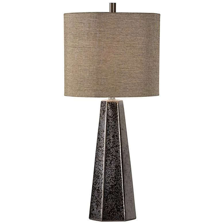 Enjoy the crisp, clean look of this ceramic table lamp design from Wildwood. A dynamic addition in any room, the lamp features a hexagonal column showing off a texture bronze finish that lends a sense of dimensionality. A silk shade and three-way switch complete this striking hand-sculpted lamp design.