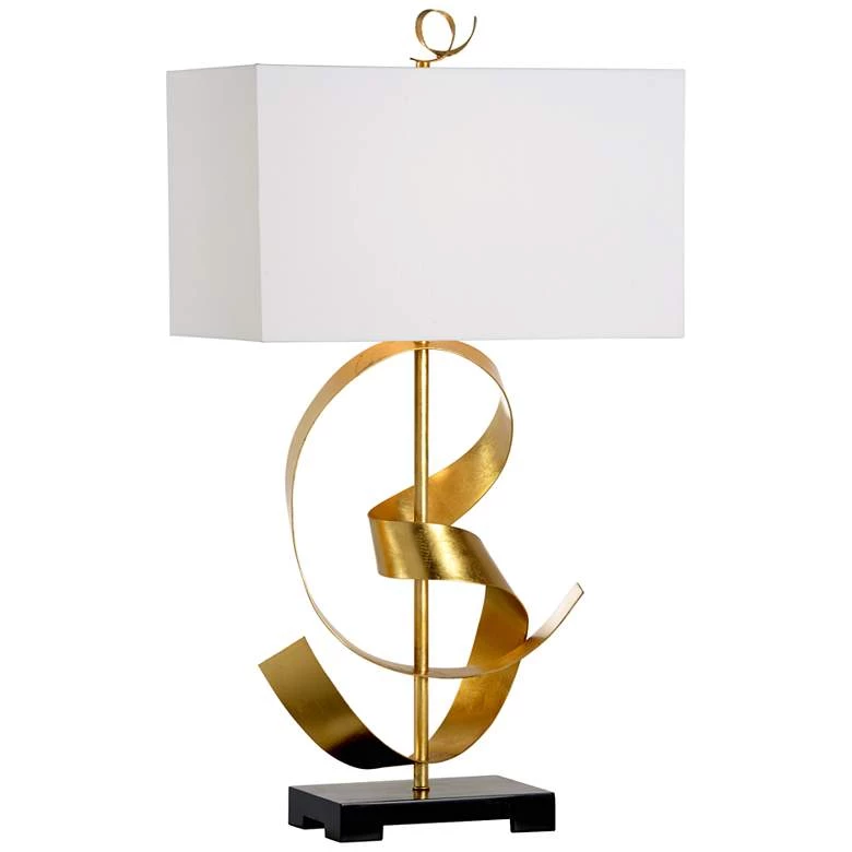 Make a modern statement with this antique gold metal table lamp by Wildwood. The sculptural base is crafted in the shape of a ribbon wrapping around a sleek metal stem. A black composite base and rectangular linen shade round out the design of this dramatic piece.