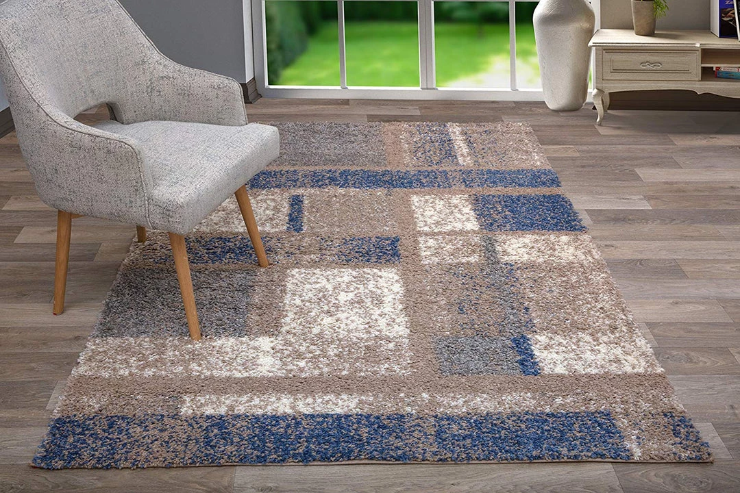 WW Geometric Pattern Blue Taupe Cozy Shag Area Rugs