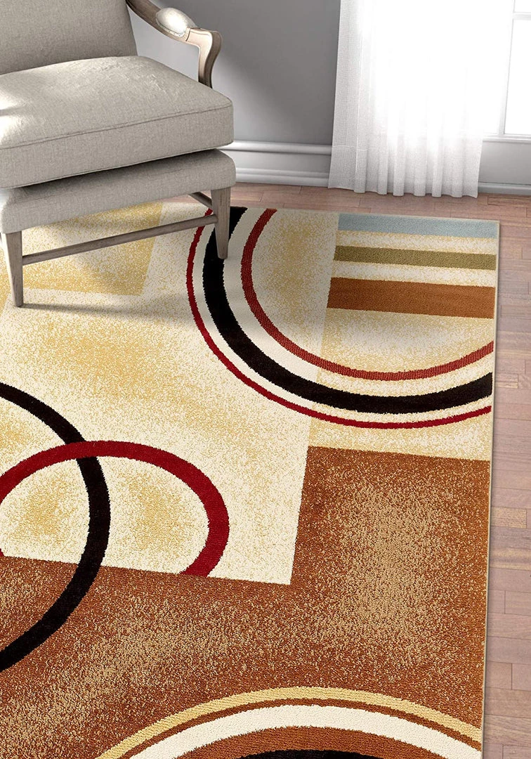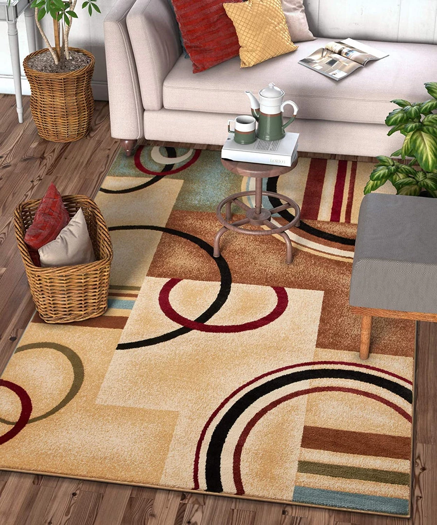 This Modern Geometric Area Rug brings together an array of patterns drawn from a carefully selected palette of Modern, European, and Persian Styles. Warm red, green, and blue jewel tones are accented by neutral tones of ivory and beige. The heat set polypropylene fiber gives a 0.4″ pile that is soft, stain resistant, and doesn’t shed or fade over time. The 100% jute backing is safe for wood floors and all four sides of the rug are serged for improved durability. A wide range of shapes, sizes, and designs means this collection has something for rooms of every size and style.
