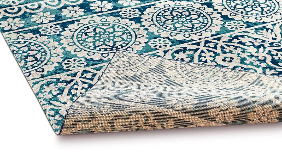 - Short, kilim-style, pile fits under doors and cleans easily. 100% polypropylene power loomed in Turkey. Stain resistant and fade resistant. 100% jute backing is safe for wood floors. Durable and made to last for years.