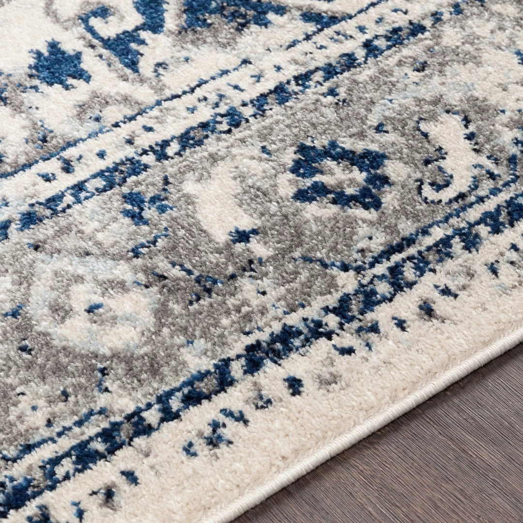 A fresh take on updated traditional patterns, the Arienne collection provides crisp tones of gray and blue suitable for any home. This medium pile synthetic rug is great for high-traffic areas and has minimal shedding. Machine made in Turkey from 100% Polypropylene. Spot clean or professionally clean only. Rug pad recommended.