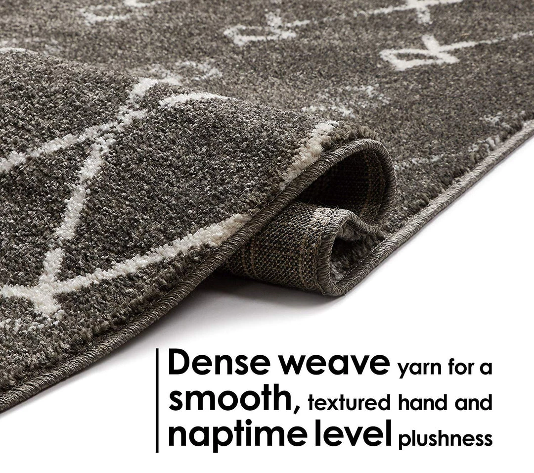Viaje Trellis Grey is a warm, bold Moroccan lattice design woven in rich colors of grey and ivory. A distressed brush effect gives the worn, vintage look of an heirloom rug to this modern, diamond trellis style.