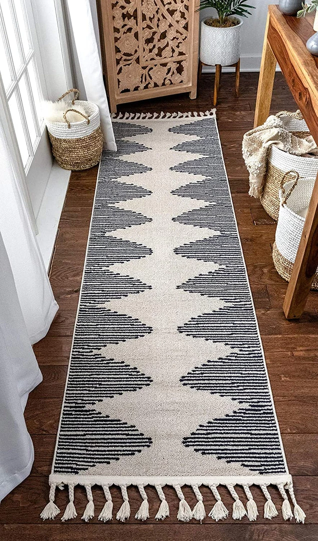 - Plush, medium-height looped pile is plush underfoot. Stain and fade resistant yarns with wood-floor-safe jute backing.
