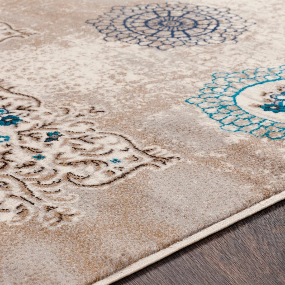 This collection merges blues, grays and neutral in a whimsical medallion design for cool, serene spaces. Features a medium pile. Machine made in Turkey with 100% polypropylene. Spot clean or professionally clean only. Rug pad recommended.